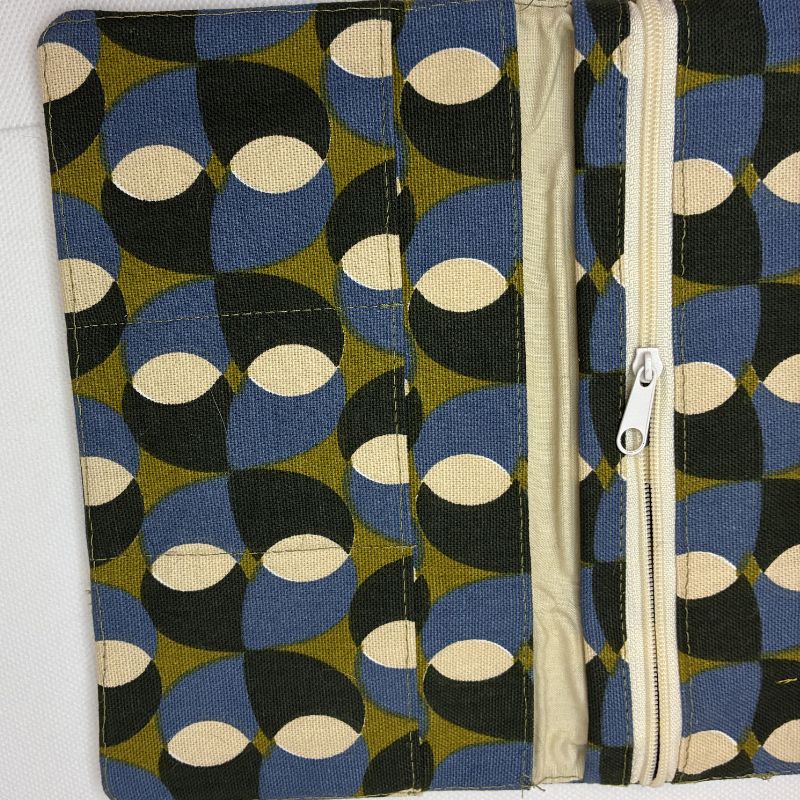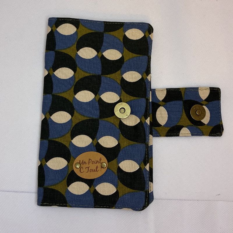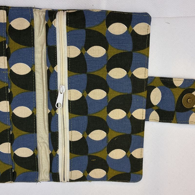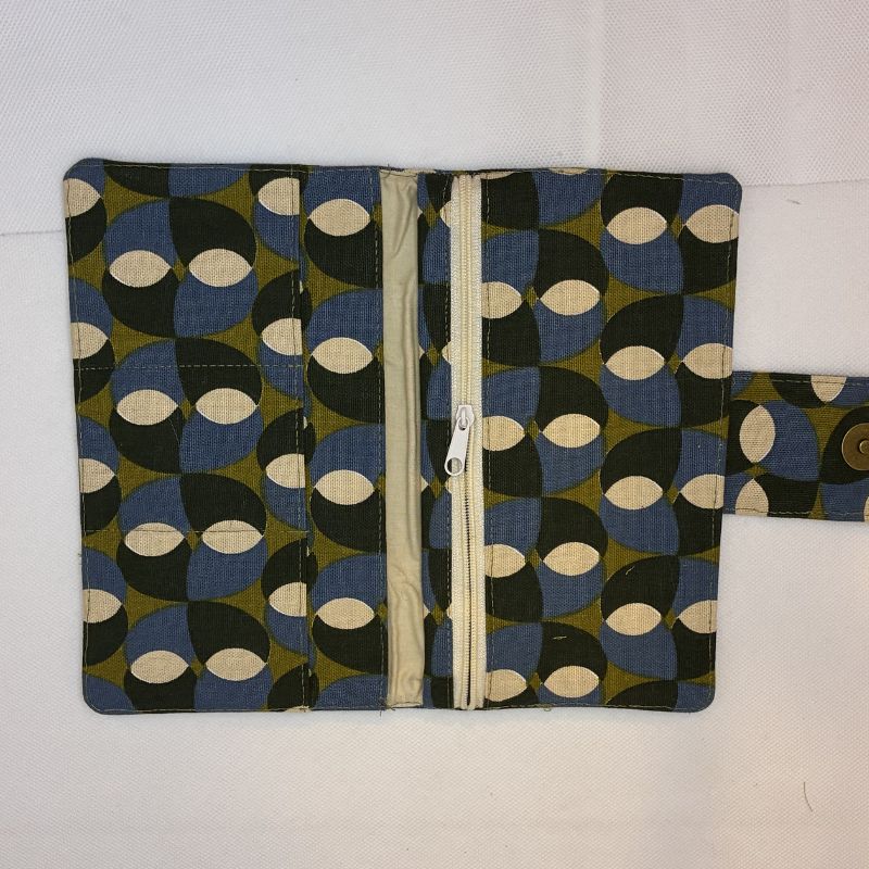 Charmant portefeuille en tissu aux motifs géométriques. À la fois élégant et pratique, il se ferme grâce à une languette avec un bouton pression aimanté.