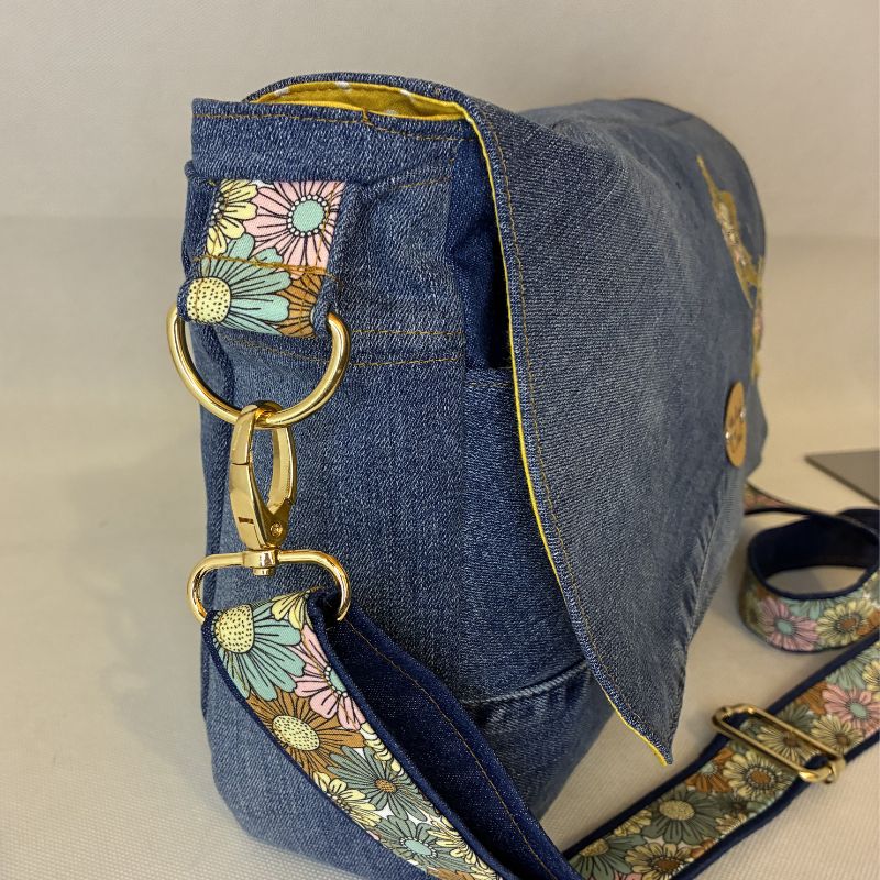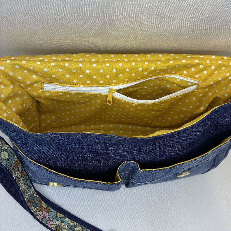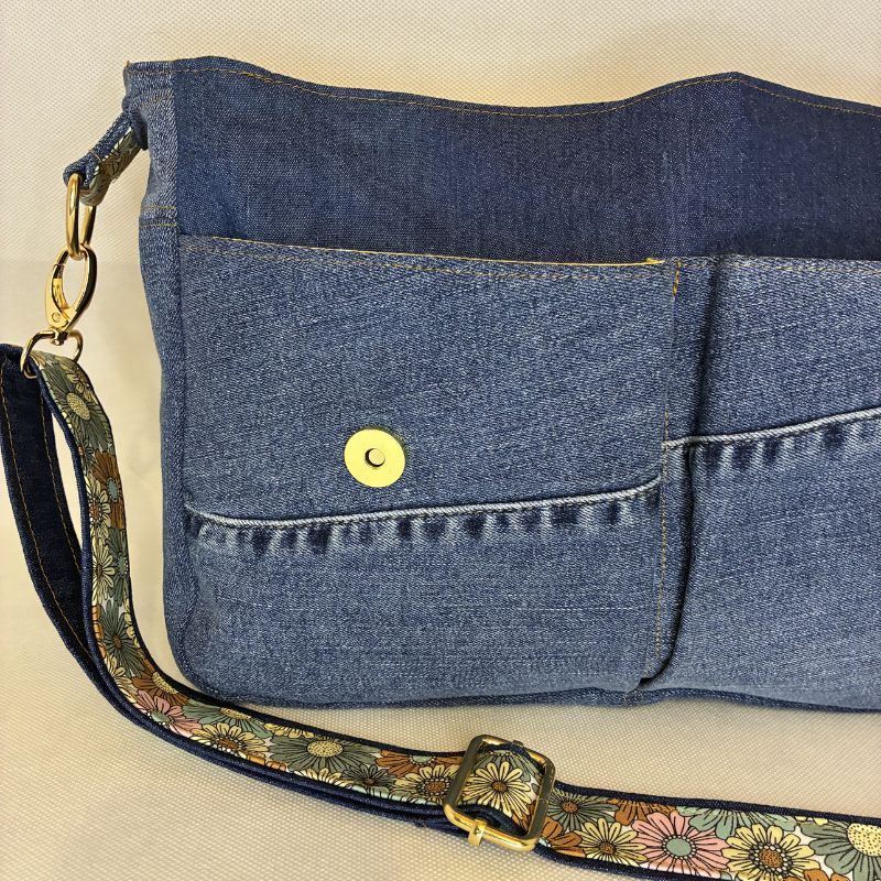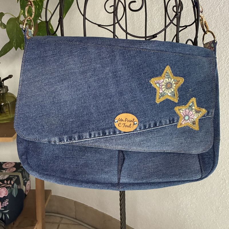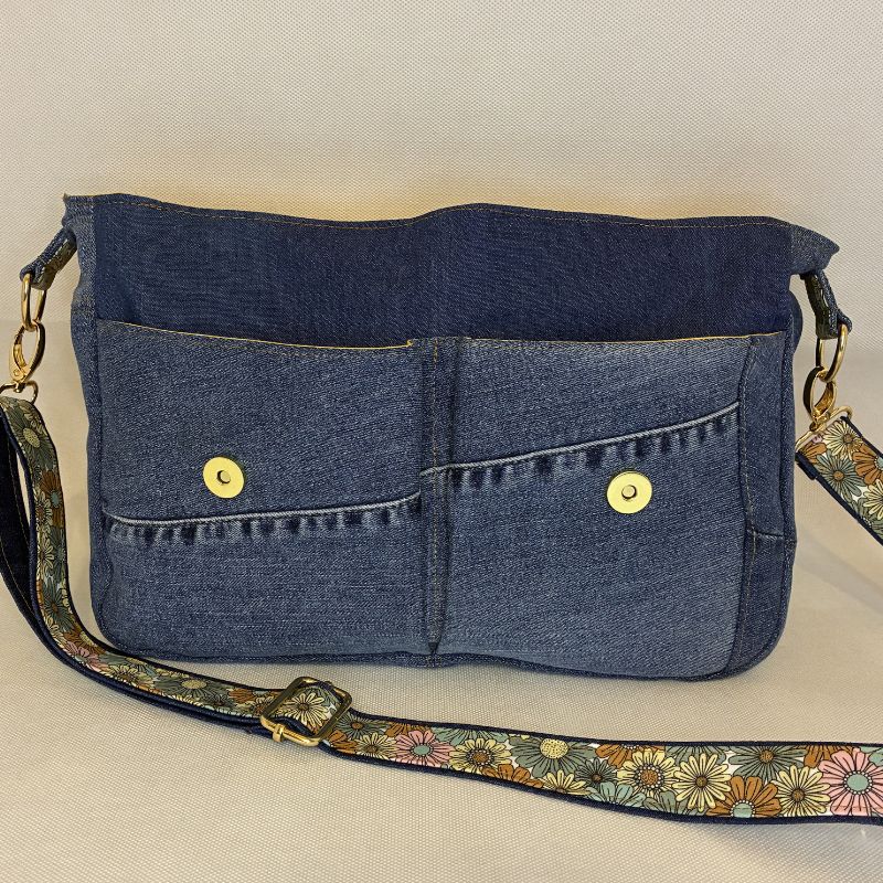 Ce sac besace en jean recyclé unique allie à la fois style et praticité. Son grand rabat se ferme avec élégance, offrant un accès facile à l’intérieur. À l’avant, deux grandes poches plaquées apportent une touche fonctionnelle tout en enrichissant son design.