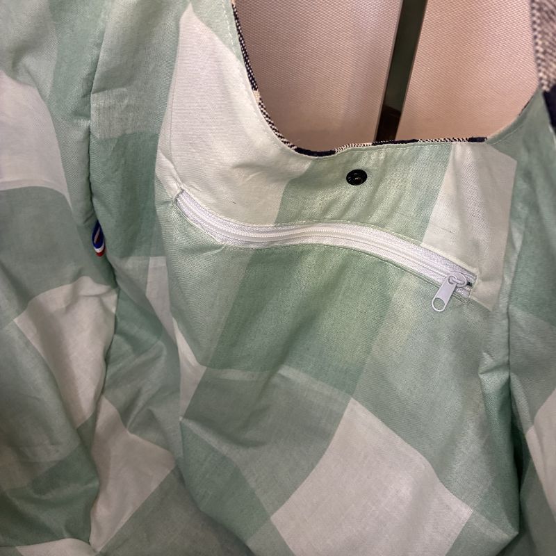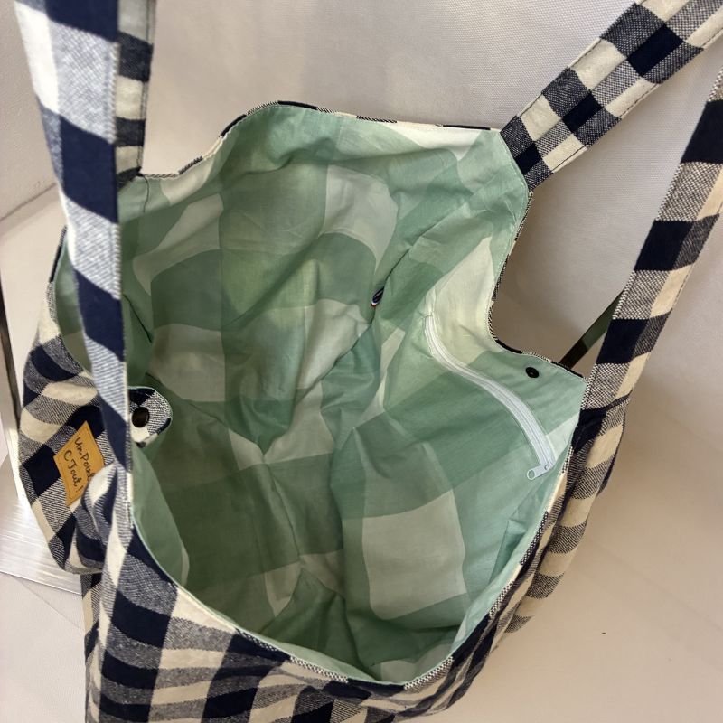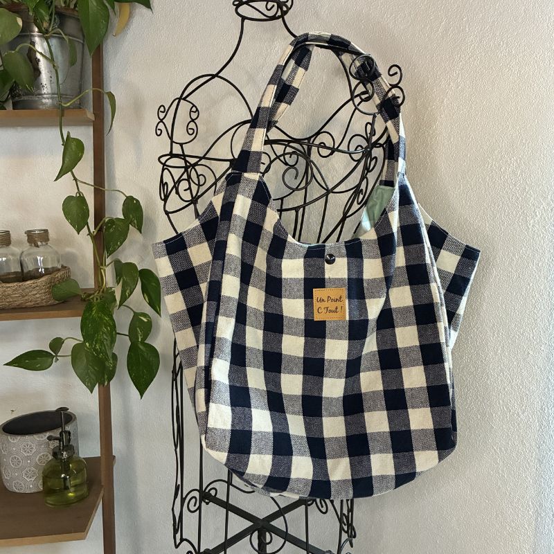 Ce sac cabas est en coton vichy marine et écru, au style à la fois intemporel et décontracté. Sa forme est souple et généreuse, idéale pour un usage quotidien (courses, plage, ville, loisirs).